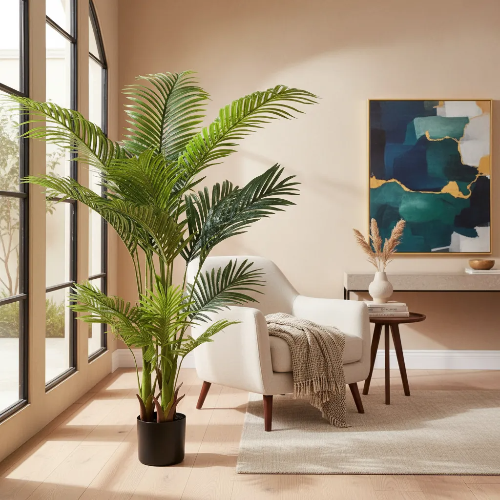 A Palmeira artificial, possui folhas com material em plástico de excelente qualidade deixando-as com aparência muito natural, as hastes possuem arame as tornando flexíveis para ajustar as folhas da forma que preferir.